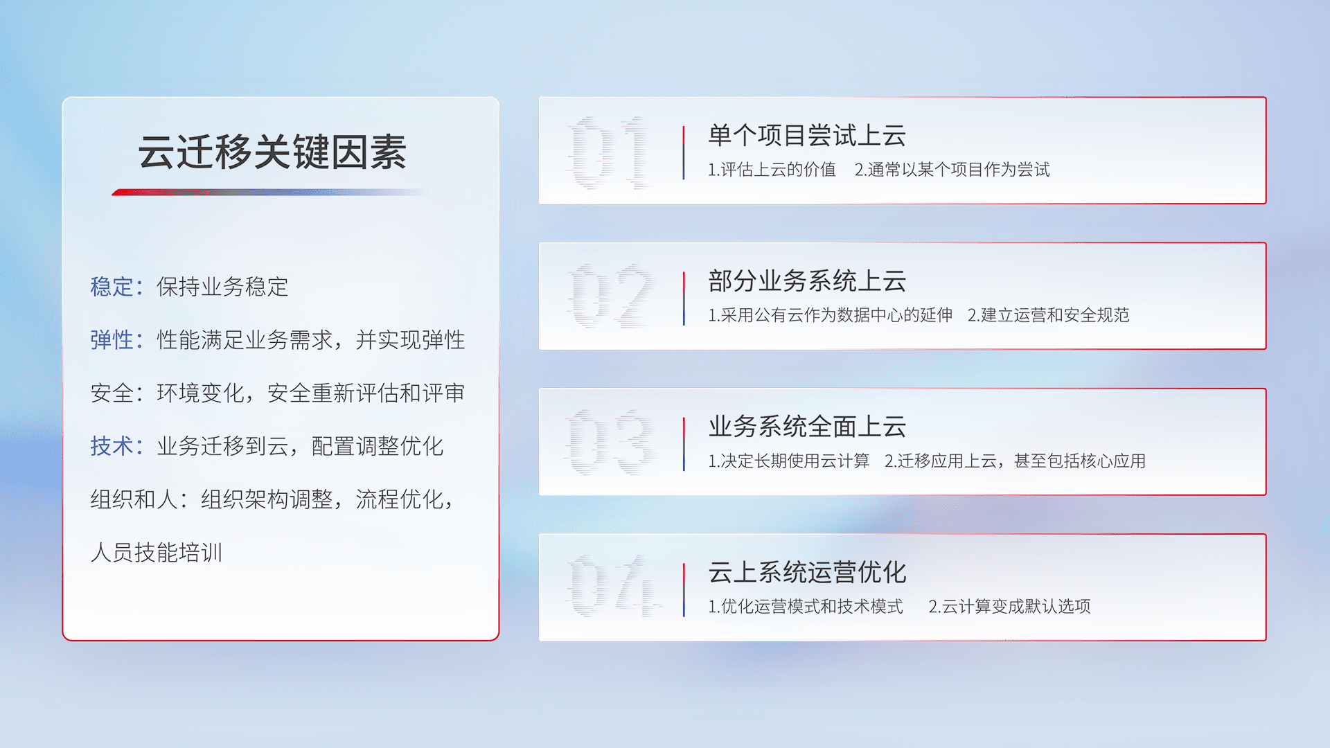结合实际业务,,,,从规划设计、、、、云平台选型、、云原生改造、、数据迁移、、、集成交付,,迁移全过程为客户识别最佳上云路径,,做好风险识别管理,,,设计网络架构、、身份权限、、、、安全审计合规、、操作审计、、日志审计、、、监控告警策略、、多站点容灾设计等,,对云上基础设施进行整体规划,,提升IT治理水平,,,以满足弹性、、、、高可用、、、高性能的需求。。。