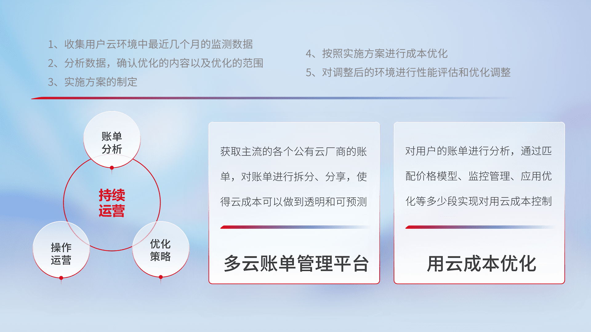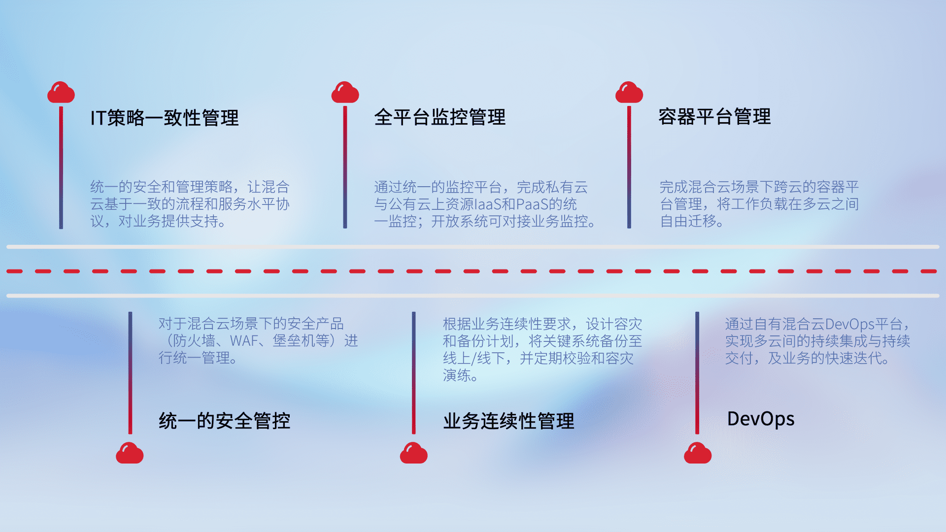 通过多云纳管,,,,以统一的资源数据模型把客户的云资源进行抽象和封装,,,进而实现对多云资源的统一操作,,保障云资源管理的可靠性、、、、稳定性与可用性。。。。量身定制化运维内容,,,,配置、、开发运维、、、、补丁管理、、、、备份、、、监控、、、认证和访问管理、、、、审计和日常巡检等,,,,保障在用云过程中的可靠度,,,稳定度以及高可用率。。