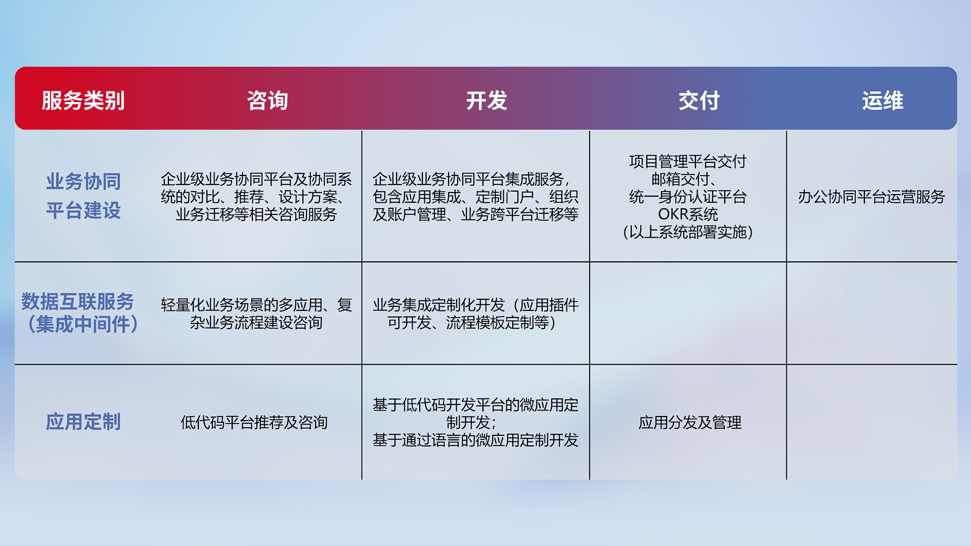 针对钉钉、、企微、、、IDaas等平台级产品提供产品的规划、、、、方案、、、交付、、定制化开发等服务,,,,实现如统一协同办公、、、智能客户服务、、、、混合会议管理、、智能数据查询、、、等业务场景,,,实现数字化转型。。。